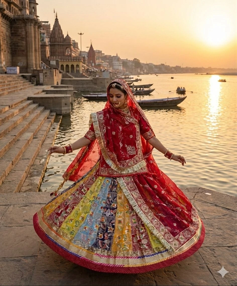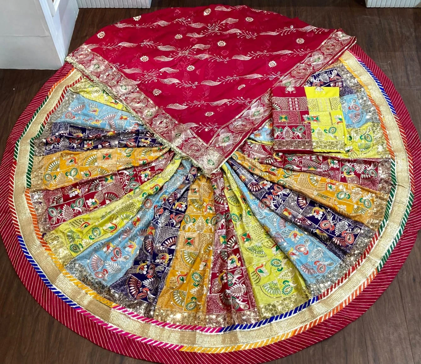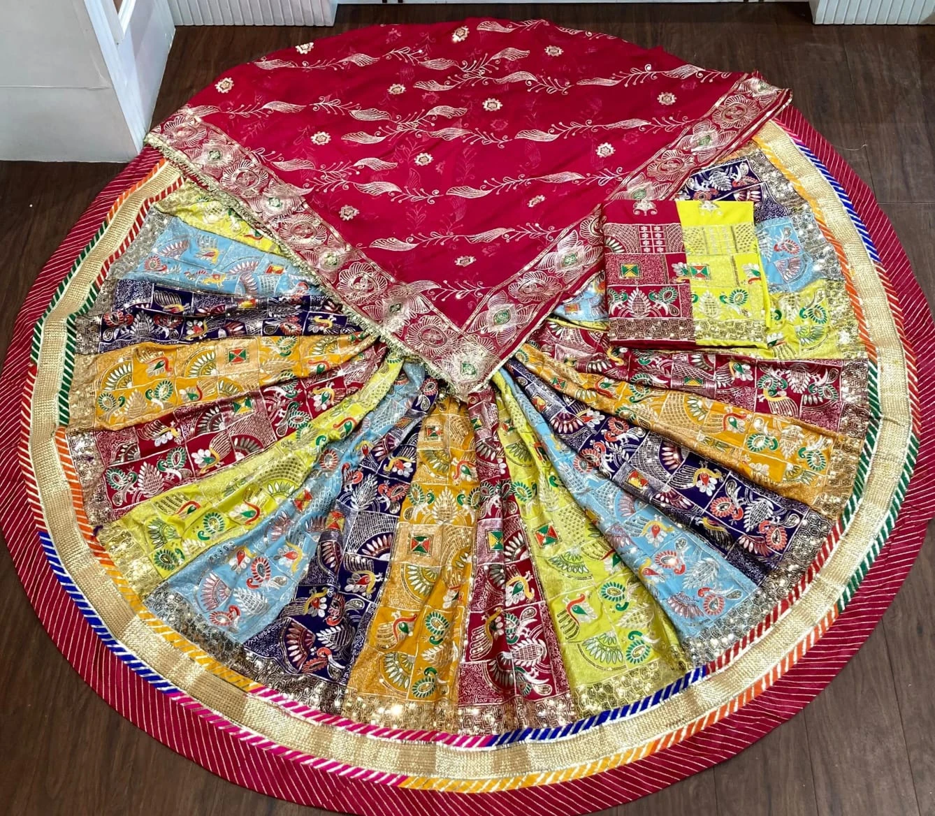 | Lehenga Style | Full Circle Flair – Heavy Multicolor Patchwork Panels |