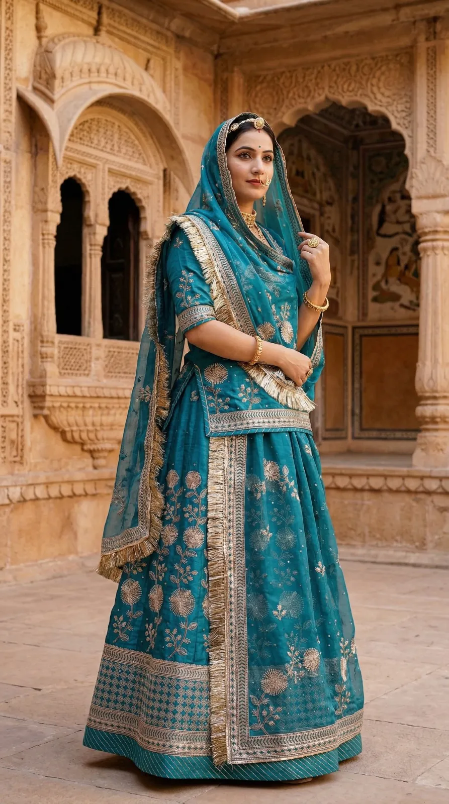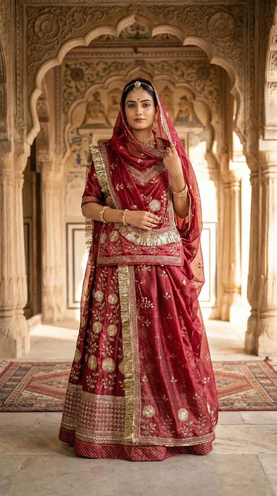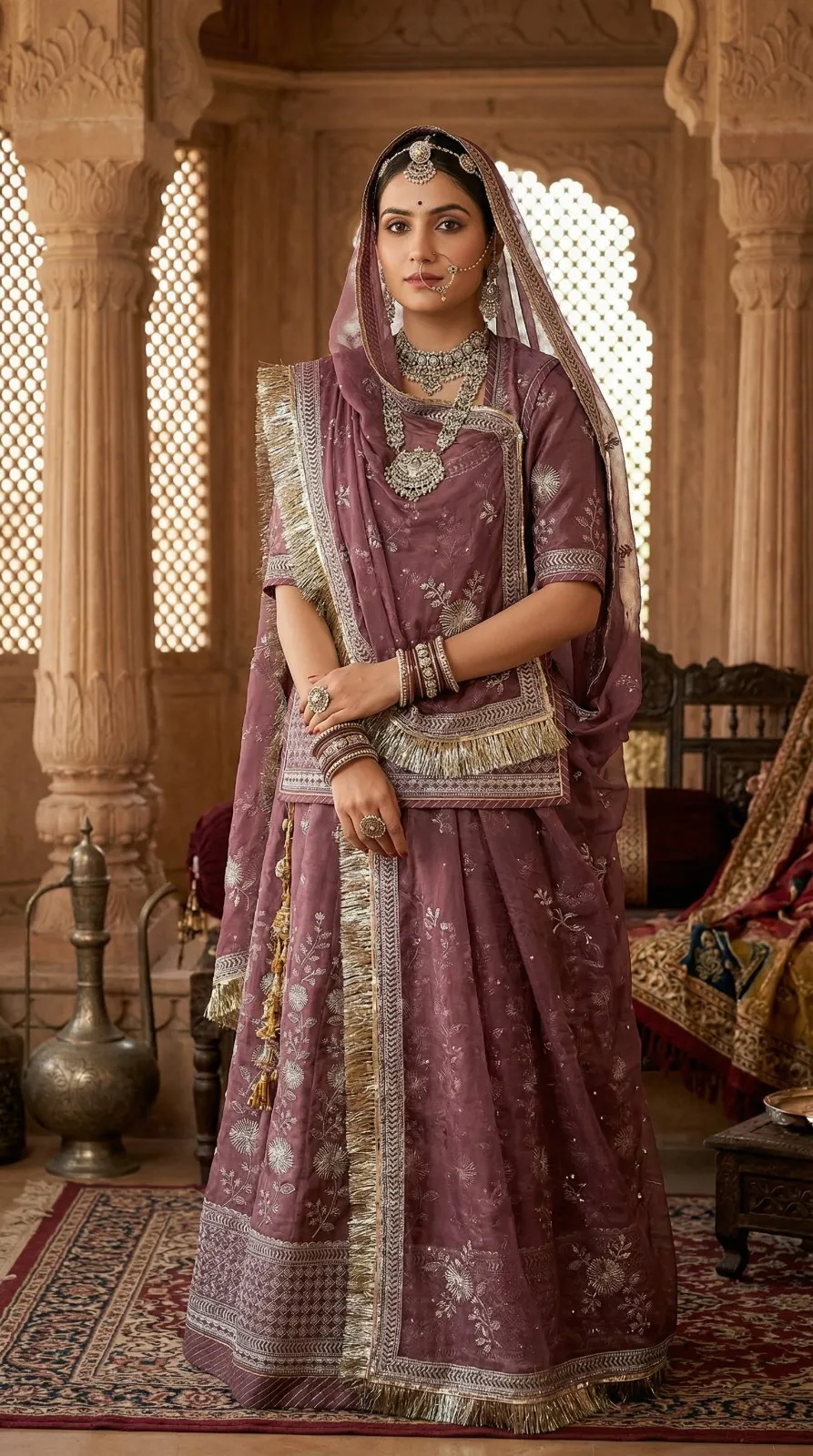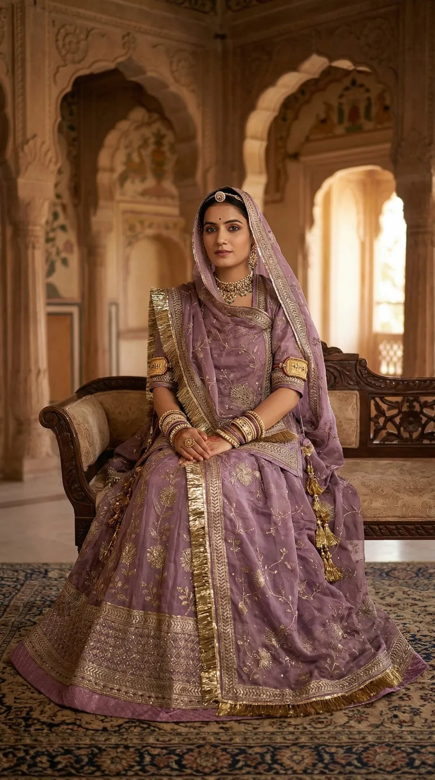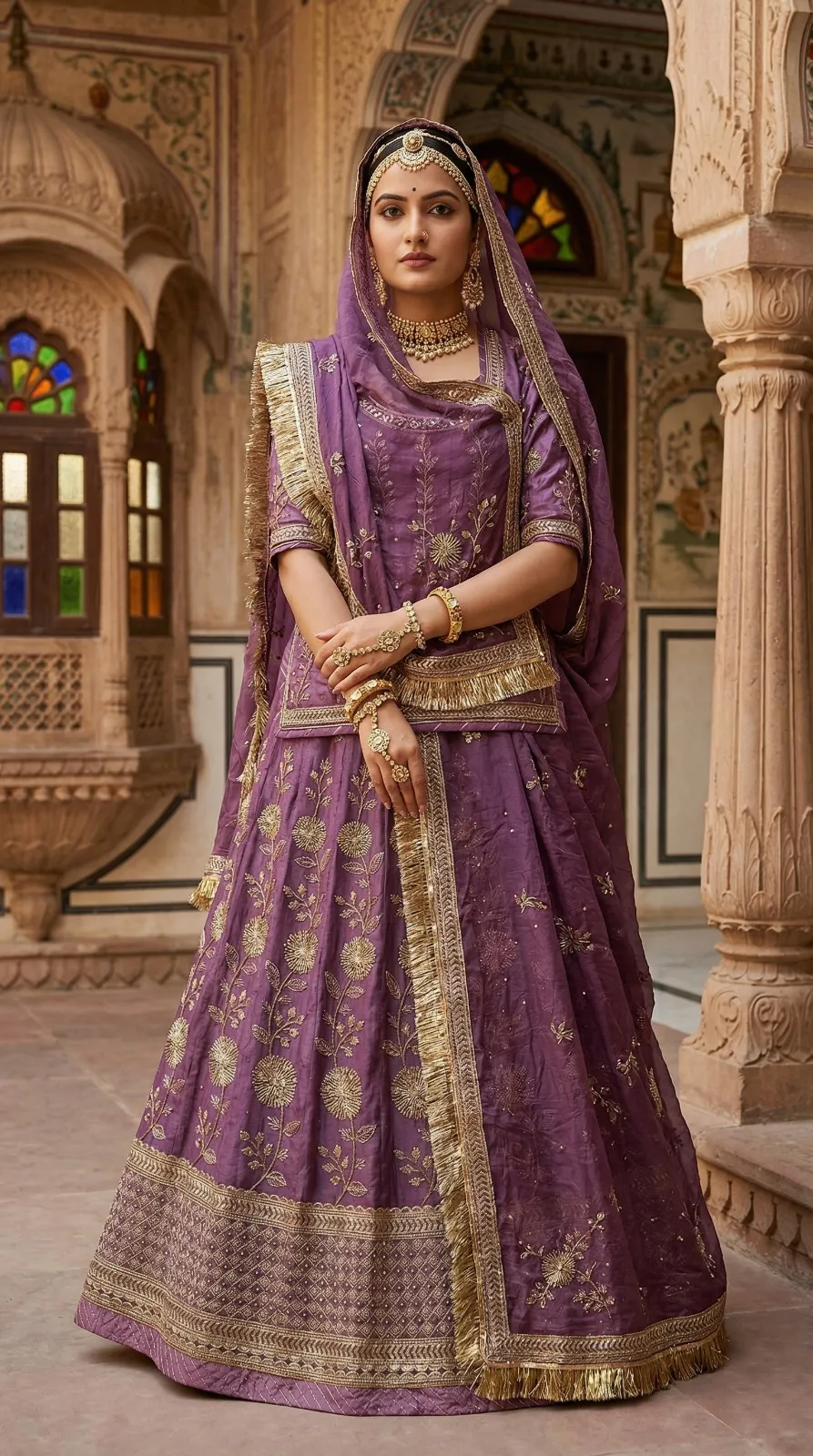 Pesh hai “Riyasat-E-Rang” — Rajputane ki shaan aur timeless craftsmanship ka ek anokha sangam. Ye lehenga us aadhunik Rajputani naari ke liye hai jo apni virasat ko garv se dhaarti hai — har kadam mein ek majestic royalty ke saath.