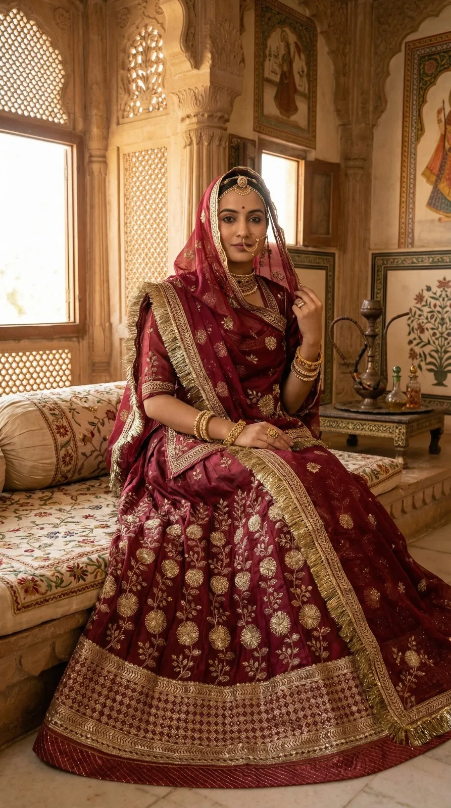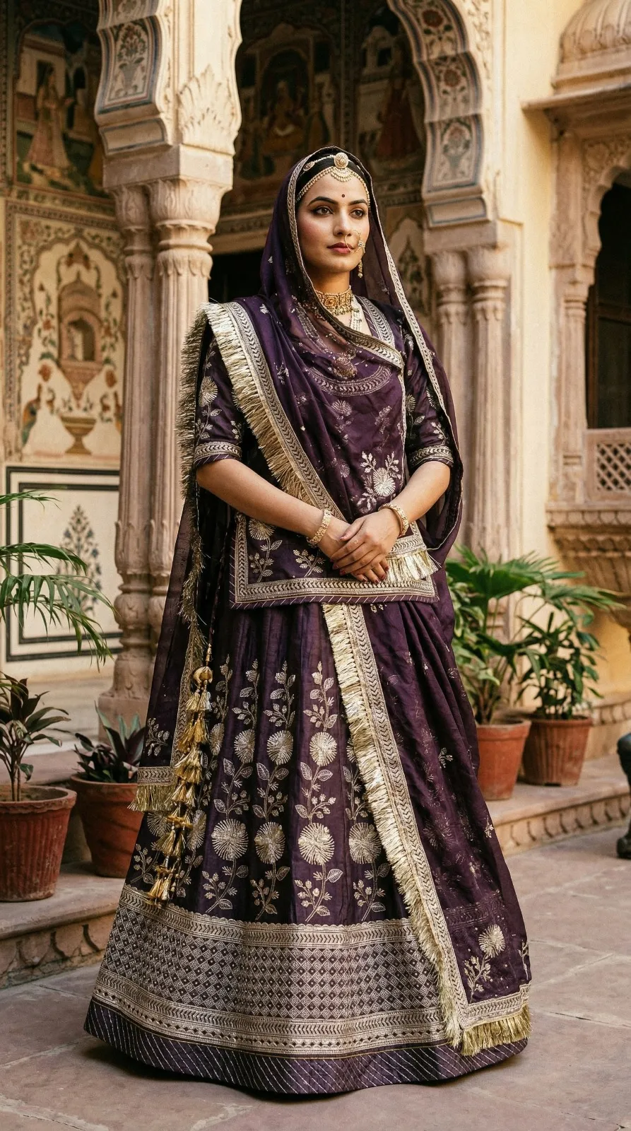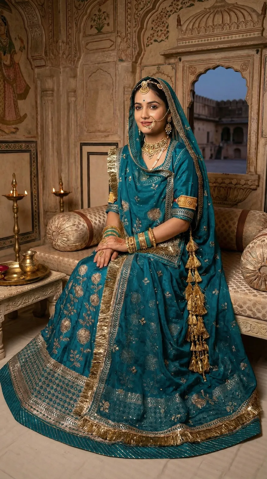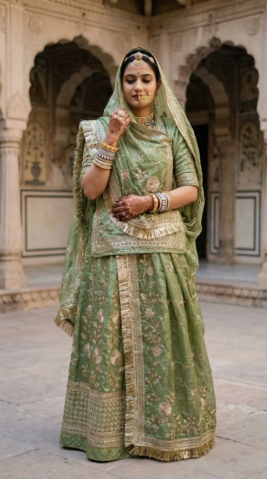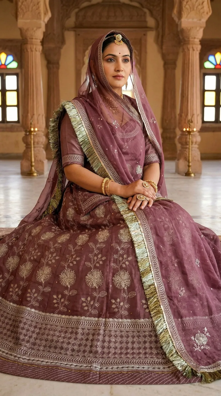 Pesh hai “Riyasat-E-Rang” — Rajputane ki shaan aur timeless craftsmanship ka ek anokha sangam. Ye lehenga us aadhunik Rajputani naari ke liye hai jo apni virasat ko garv se dhaarti hai — har kadam mein ek majestic royalty ke saath.
